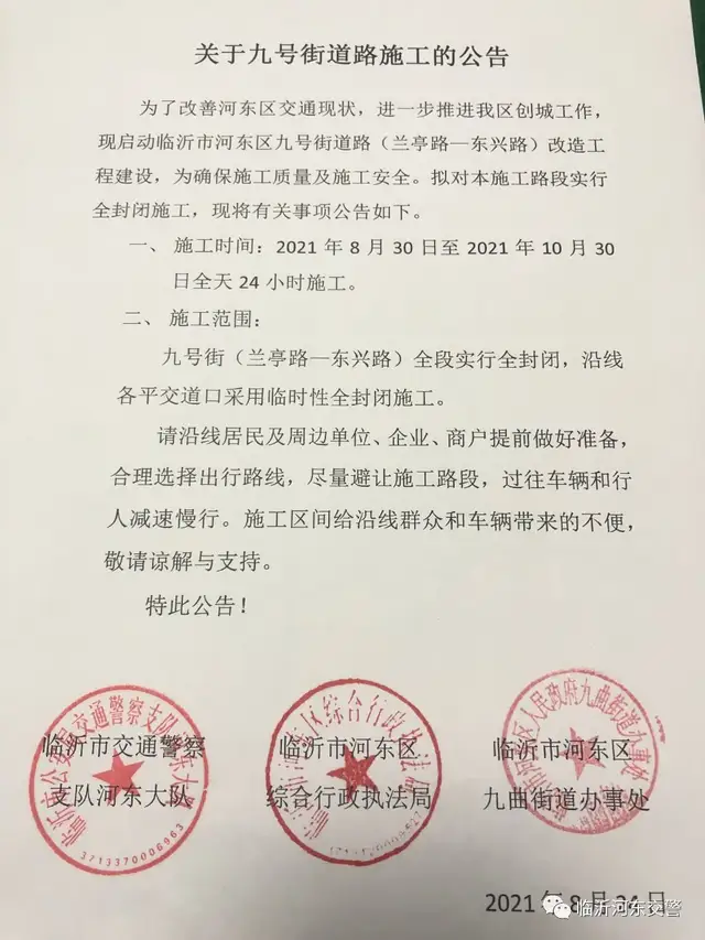 为了改善河东区交通现状,进一步推进我区创城工作,现启动临沂市河东区九号街道路(兰亭路—东兴路)改造工程建设,为确保施工质量及施工安全。拟对本施工路段实行全封闭施工,现将有关事项公告如下。