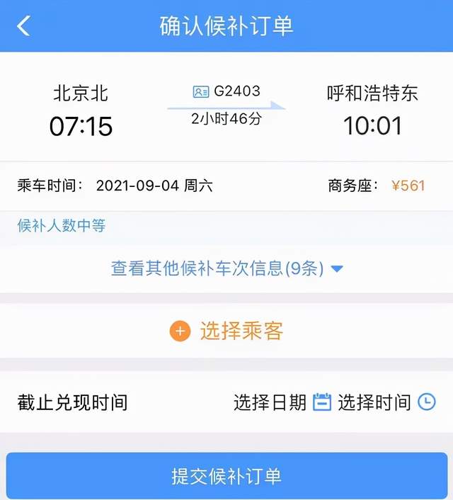 候补购票:使用“候补购票”功能,只要有退票或余票,系统会按排队顺序购入哦!每位用户可有2个候补订单,同一候补订单里,每个乘车日期最多可包含5个不同“车次+席别”的组合需求。