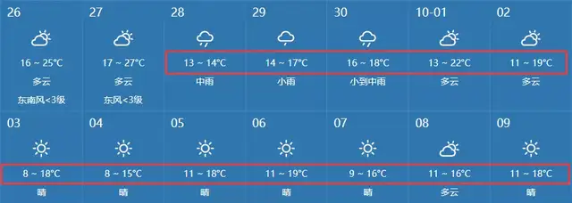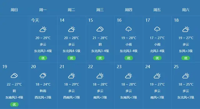 14日白天到夜间,多云,东北风3~4级阵风5~6级,气温28~20℃;