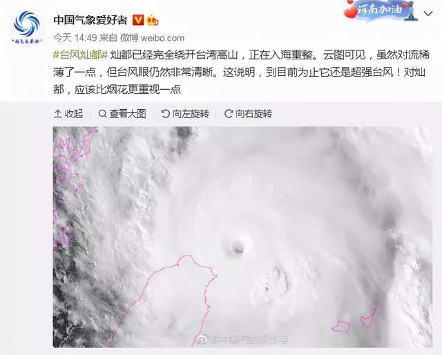 12日下午,网络大V@中国气象爱好者 也发帖称,“灿都”的台风眼非常清晰,这说明,到目前为止它还是超强台风!“对灿都,应该比烟花更重视一点!”