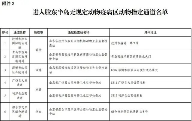 进入胶东半岛无规定动物疫病区动物指定通道名单(点击下图可放大)