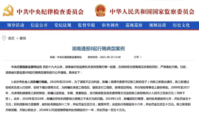 9月23日,湖南省纪委监委通报了8起行贿典型案例。