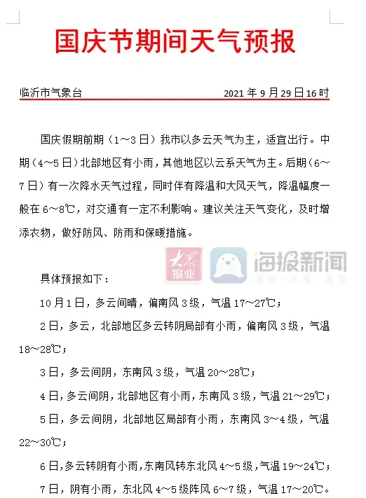 据临沂市气象台预报,国庆假期前期(1~3日)全市以多云天气为主,适宜出行。