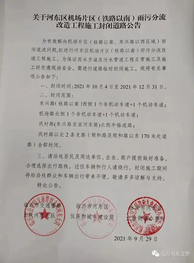 为有效解决机场片区(铁路以南、东兴路以西区域)雨污混流问题,拟进行河东区机场片区(铁路以南)雨污分流改造工程施工。为保证雨水方涵及污水管道工程正常施工及施工时交通现场安全,需进行道路临时封闭施工,现将有关事项公告如下: