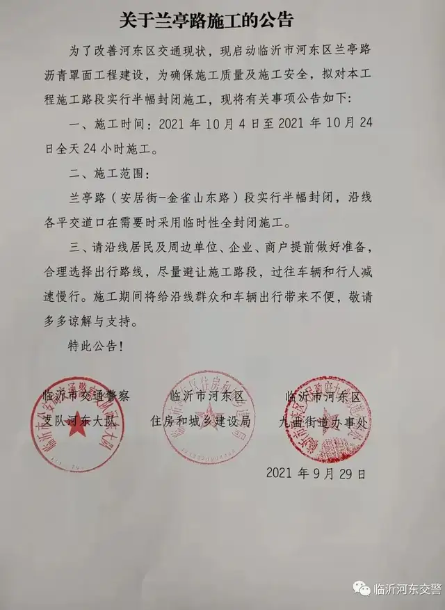 为了改善河东区交通现状,现启动临沂市河东区兰亭路沥青罩面工程建设,为确保施工质量及施工安全,拟对本工程施工路段实行半幅封闭施工,现将有关事项公告如下: