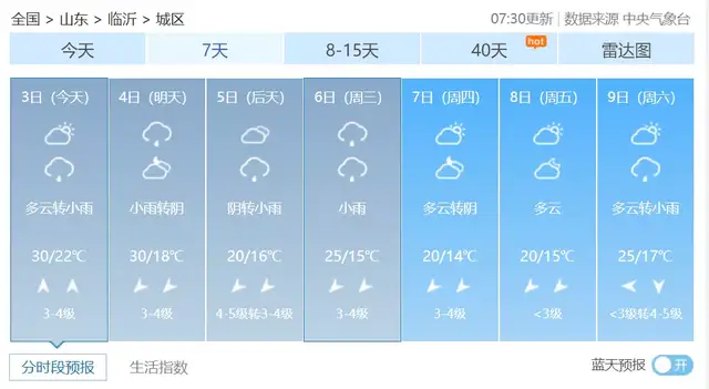 3日白天到夜间,多云转阴,大部地区有小雨北部地区局部中雨或大雨,南到东南风3~4级,气温30~22℃;