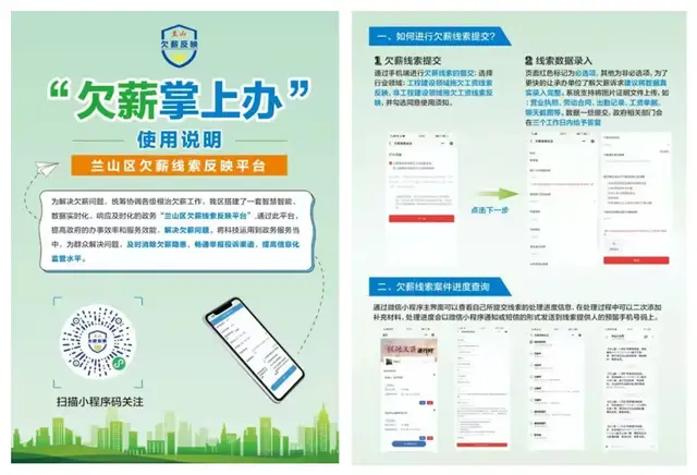 被欠薪人员可以通过微信搜索“兰山区欠薪线索反映平台”或扫描二维码进入微信小程序,注册登录后,填写欠薪线索并录入营业执照、工资单据、聊天截图等证明文件,点击提交即可。处理进度会通过短信的形式反馈给反映人,减轻了反映人来回“跑部门”的负担。