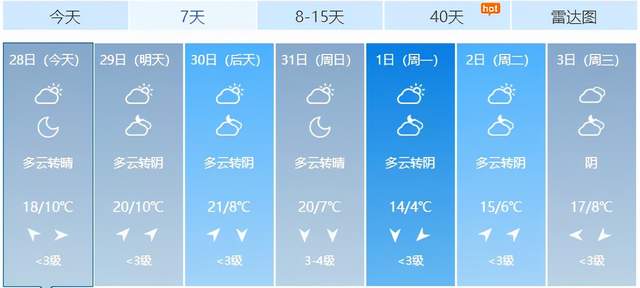 10月30日白天到夜间,多云间阴,偏南风转偏北风3级,气温21~8℃;