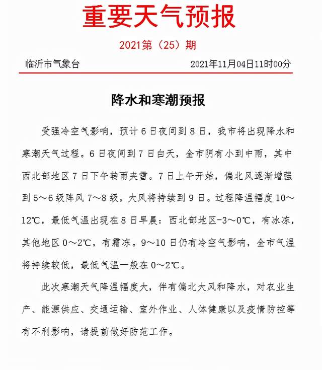 临沂发布降水和寒潮预报