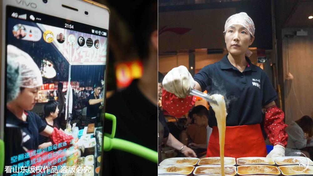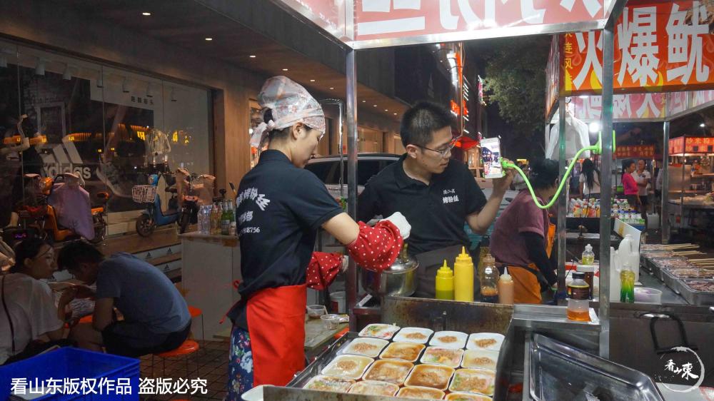每天下午六点他们准时出摊,晚八点食客渐多打开网络直播。“老铁双击666加关注,吃烤粉丝就到兰田步行街”图为李超在采访食客对烤粉丝的体会。
