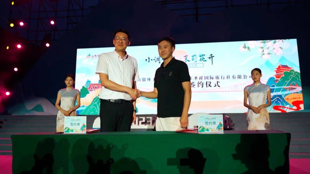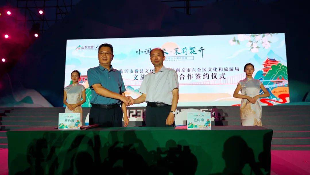 在此次2023沂蒙山小调音乐周活动现场,南京市六合区文化和旅游局局长田志文和费县文化和旅游局党组书记、局长王波上台签约。山东天蒙旅游开发有限公司副总经理刘海洋、南京圣祥国际旅行社有限公司副总经理陈越瀚上台签约。双方未来将以合作新模式,深化景区与旅行社的协作,实现资源共享、合作共赢新格局。