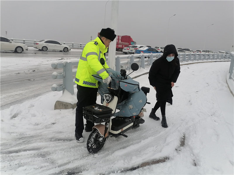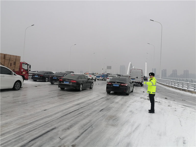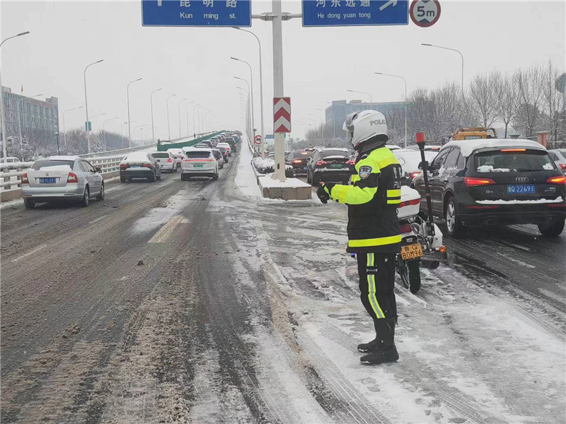 1月16日,我市普降大雪,大雪给路面增添了几分姿色,同时也给群众出行带来诸多不便,因道路出现不同程度积雪、路面较为湿滑,给行车带来极大的安全隐患,为最大限度预防和减少交通事故发生,确保群众出行安全,河东交警大队以雪为令,快速反应,立即启动恶劣天气应急预案,最大限度屯警路面,用实际行动为群众出行保驾护航。