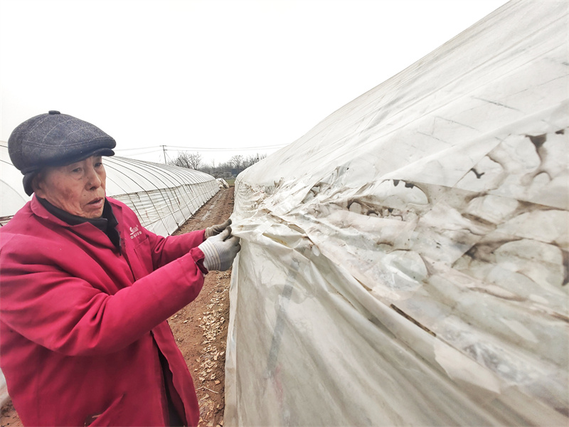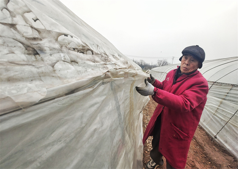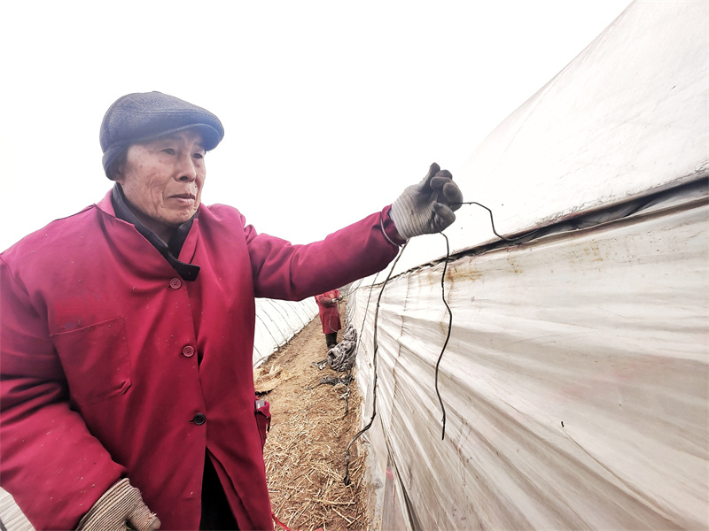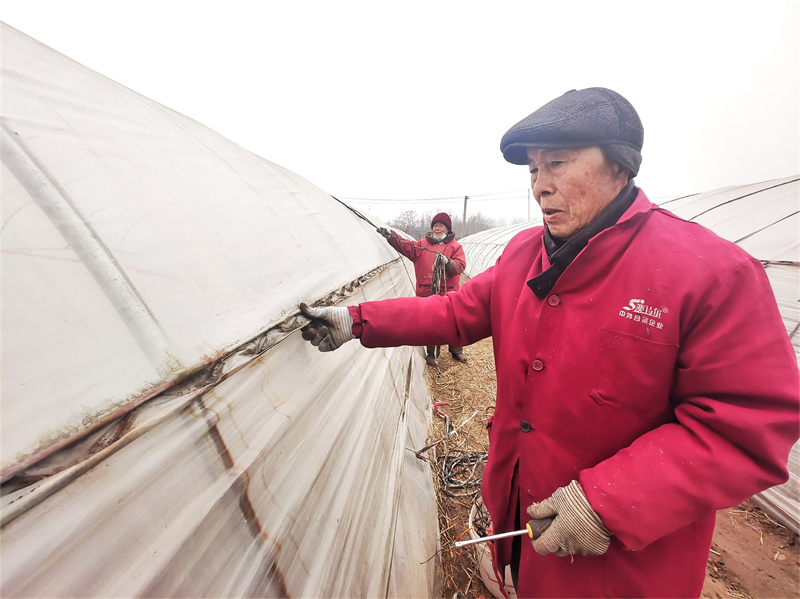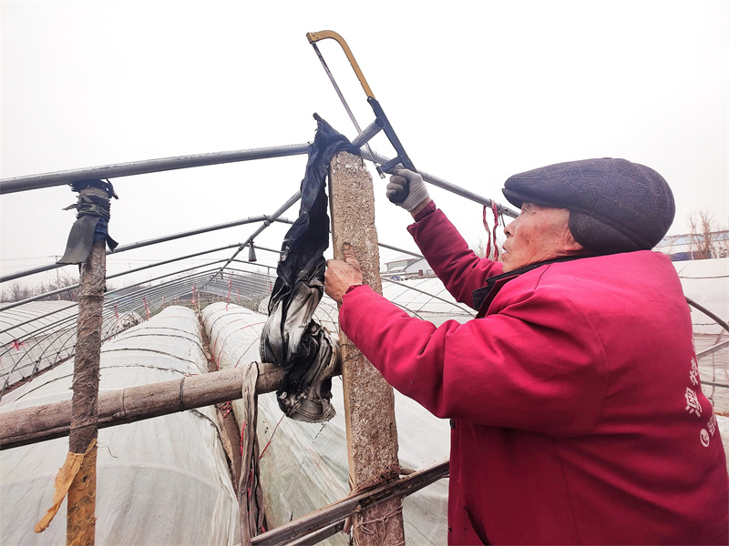 临沂在线讯(高军)1月30日,郯城县马头镇采莲湖社区南新庄村杜勇田、梁德兰老两口正在更换破旧塑料大棚布,提前做好蔬菜大棚的御寒,确保蔬菜不受损失。