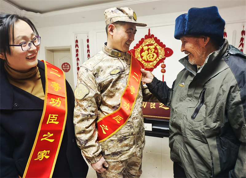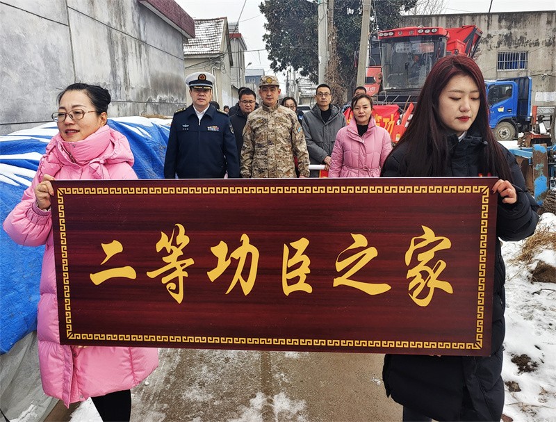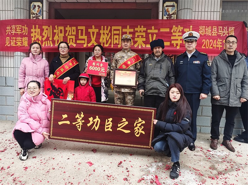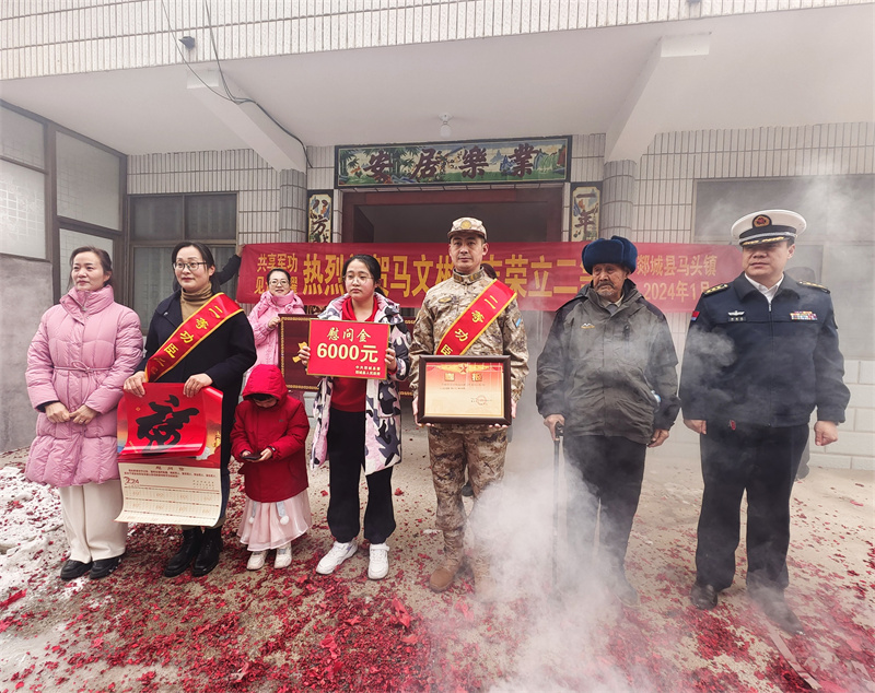 临沂在线讯(高军)2月4日,立春,郯城县马头镇杨庄村传来现役军人马文彬荣立二等功好消息。92岁老兵马继成带着儿子、孙子马文彬,三代人一起迎接送喜报慰问团。郯城县人武部、退役军人事务局等部门慰问小组,不仅送来了二等功喜报,而且奖励了6000元慰问金。