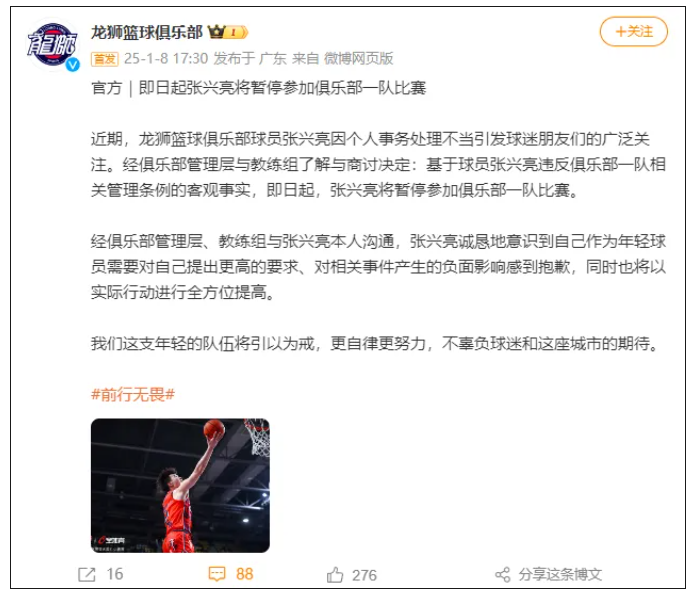 俱乐部表示:近期,龙狮篮球俱乐部球员张兴亮因个人事务处理不当引发球迷朋友们的广泛关注。经俱乐部管理层与教练组了解与商讨决定:基于球员张兴亮违反俱乐部一队相关管理条例的客观事实,即日起,张兴亮将暂停参加俱乐部一队比赛。