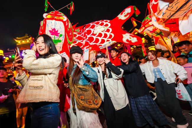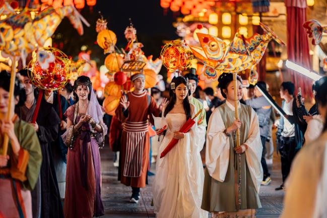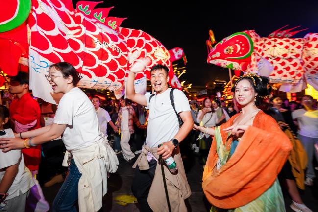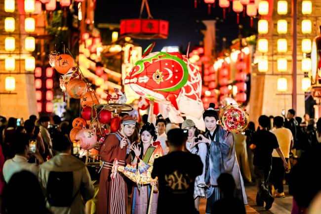 此外,今年国庆期间恰逢中秋,琅琊古城精准地抓住了这一节庆契机,精心打造了一场极具国风韵味、高颜值呈现的中秋主题巡游演艺,让传统文化以极具视觉冲击力和参与感的方式焕发新生。该演艺融合非遗鱼灯、高跷喷火、非遗盒子灯、烟花瀑布等表演形式,不仅完美契合了节日氛围,其本身壮观、梦幻且易于传播的视觉特性,也使之成为了天然的短视频爆款素材。它主动为游客提供了极具分享价值的画面与体验,让参与传统节庆,成为一种时尚、有趣的行为,更成功俘获了大批作为传播主力的年轻群体。