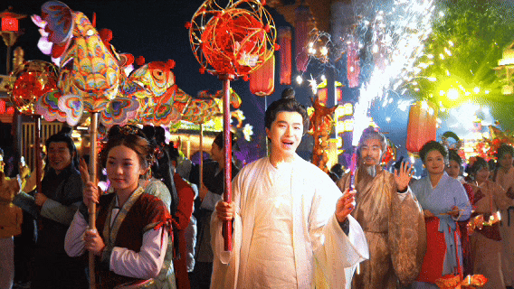 一场流传千年的上元灯会重现,鱼灯摇曳,各式灯笼宛若繁星流动。你可以提灯加入巡游队伍,看高跷喷火;赏漫天星河洒落长街,感受琅琊盛世风华。