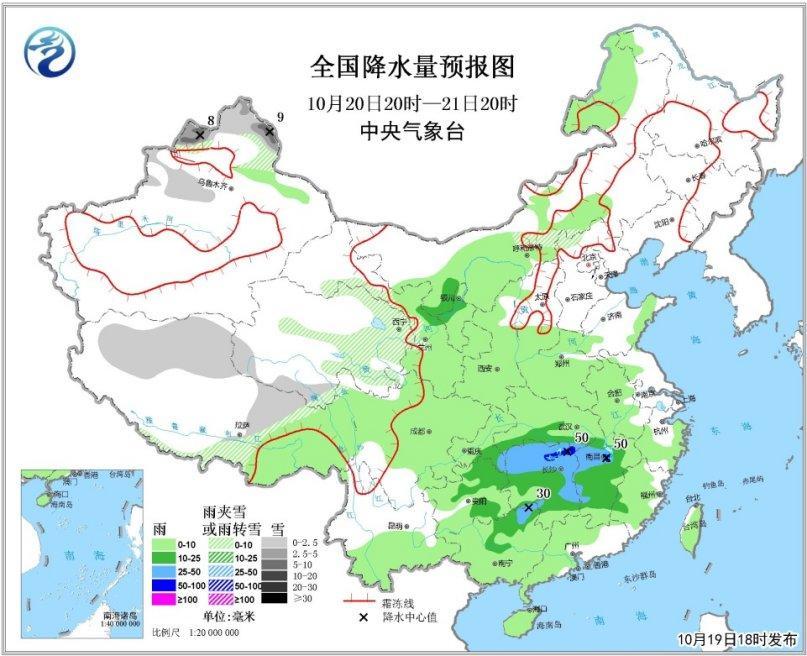 10月20日20时至21日20时,新疆北部、西藏北部和东部、青海中东部、内蒙古中部甘肃河西和中部、河北西北部等地部分地区有小雪或雨夹雪,其中北疆北部和东部等地部分地区有中雪,局地大雪(5~9毫米)。宁夏北部、江汉南部、江南中西部、湖北南部、西南地区东南部和广西东北部等地部分地区有中到大雨,其中,湖北东南部、湖南北部和江西北部等地部分地区有暴雨(50毫米)。新疆北部等地部分地区有4~6级及以上风(见图2)。